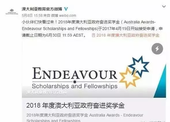 澳大利亚驻华使领馆和澳大利亚教育官方微博就不声不响的发布了2018澳大利亚政府奋进奖学金已经开放申请的消息: