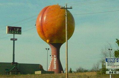 桃子水塔建造于1981年,由钢铁和混凝土制成,具有完整的桃型结构,包括叶子、茎以及桃子上那条非常有趣的折痕。桃子水塔有四层楼、150英尺高,为世界上最大的桃子模型,可容纳100万加仑的水,在几英里外就可观赏到这座巨大的桃子水塔。桃子水塔的身影也经常出现的荧幕上,电影《迷失美国》和美国电视连续剧《纸牌屋》的部分场景就是在此取景。