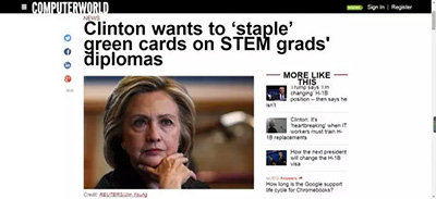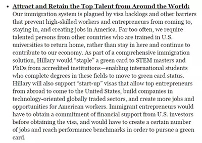 希拉里说,她希望美国政府可以为“从认证机构毕业的”(非美国公民)STEM专业硕博毕业生“绑定”绿卡。除此以外,她也将会支持为优秀的外国企业家而设的“start-up”签证,鼓励他们进入美国开办科技公司,为美国劳动者创造更多就业机会。