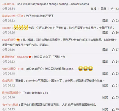 然而,在此计划公布后,大部分的中国留学生似乎都持怀疑态度,对希拉里此举并不买账。