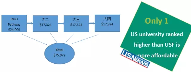 生活低消费!住在坦帕的花费比美国平均的生活开销低12.3%,并且要大大的低于加利福利亚,纽约,波士顿,首都华盛顿或是其他北美洲的东部主要城市。学费低,通过INTO pathway 完成本科四年学习的学费总共四年人民币50万(如下图):