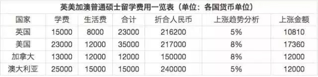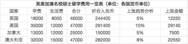 从上可以明显看出,英国名校硕士留学学费平均约18000英磅,生活费平均8000英磅,总费用平均46000英磅,预估每年会有5%左右的涨幅;