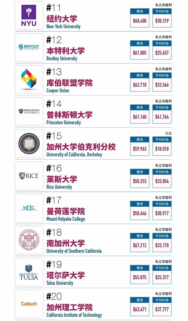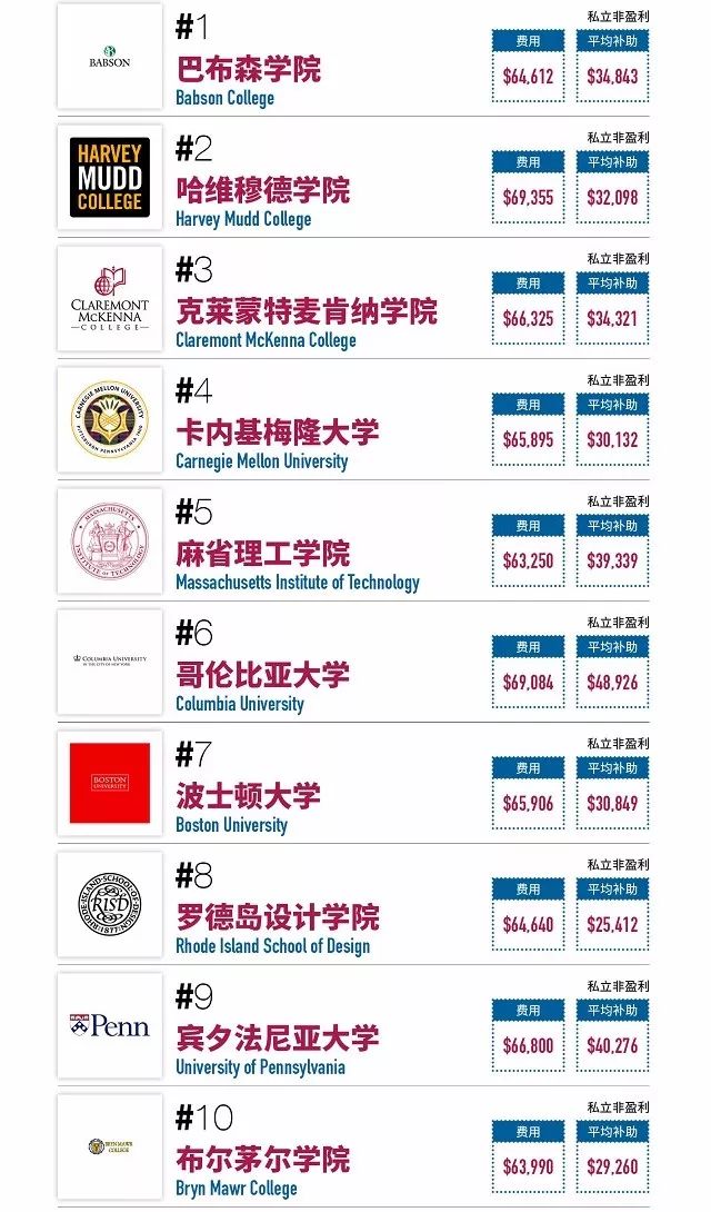 紧随其后的是哈维穆德学院,这所顶级文理学院的毕业生薪资常年位于payscale前列。第三名依然是文理学院克莱蒙特麦肯纳学院。卡耐基梅隆大学、麻省理工学院分别排名第四、第五。前十名的5所由哥大、波士顿大学、罗德岛设计学院、宾大和布尔茅尔学院占据。可以看到,排名TOP10有小型文理学院,有顶级综合研究型大学,也有关注创新和动手实践的商学院,还有知名艺术院校。每一个留学生都能找到适合自己的学校类型。