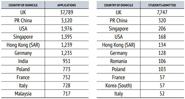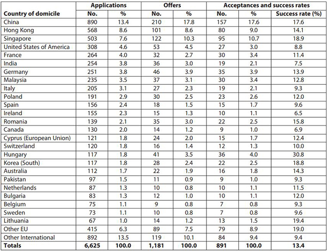 2018年,剑桥申请国际生人数最多的是中国大陆地区,中国香港位列第二。大陆地区的申请人数为890人,获得offer 210人,获得最终录取的是157人;香港地区的申请人数为568人,获得offer 101人,获得最终录取的人数是80人。