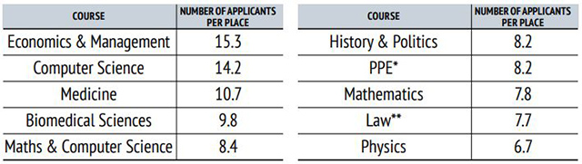 牛津申请竞争最激烈的十个专业分别是:经济与管理;计算机科学;医学;生物医学科学;数学与计算机科学;历史与政治;PPE;数学;法律;物理。