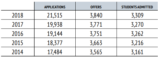 2018年,牛津本科一共有21,515 人申请,发放offer 3,840份,获得最终录取的学生为3,309人。2014-18年申请人数是逐年增加的,去年是涨幅最为明显的一年,也是实际录取人数首次略高于3,300人。