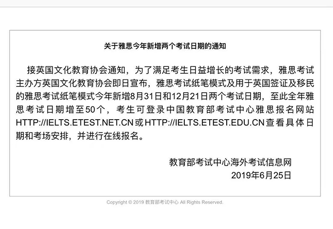 接英国文化教育协会通知,为了满足考生日益增长的考试需求,雅思考试主办方英国文化教育协会即日宣布,雅思考试纸笔模式及用于英国签证及移民的雅思考试纸笔模式今年新增8月31日和12月21日两个考试日期,至此全年雅思考试日期增至50个,考生可登录中国教育部考试中心雅思报名网站HTTP://IELTS.ETEST.NET.CN
