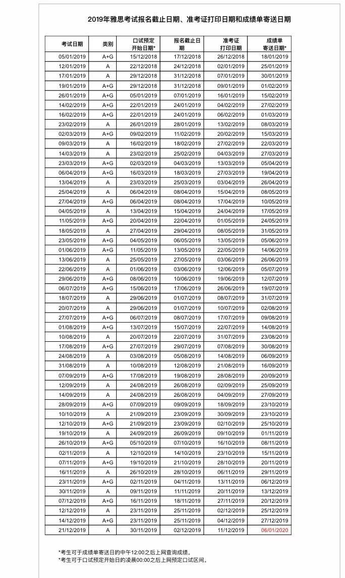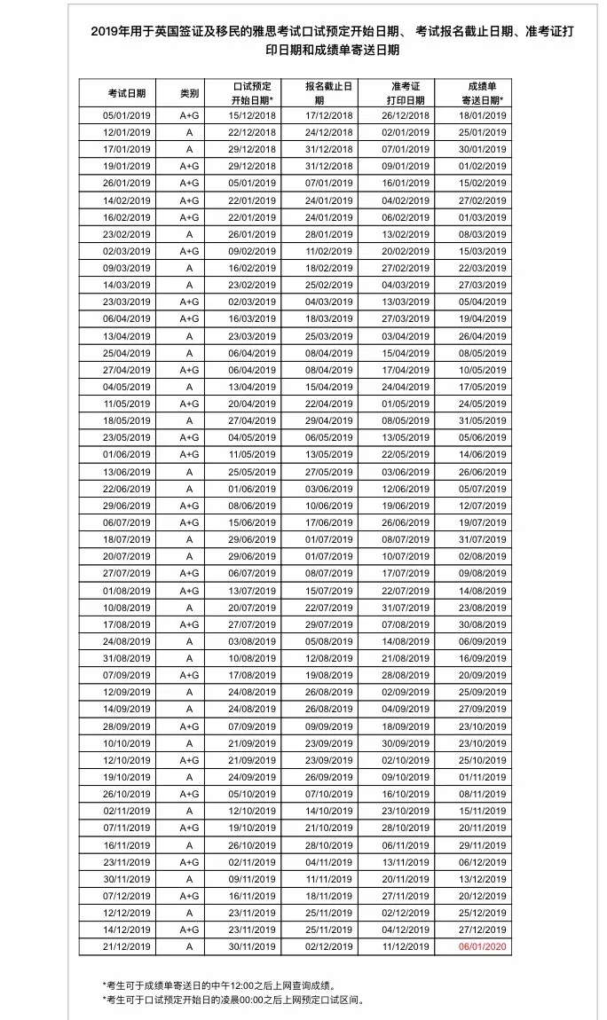 (2)2019年用于英国签证及移民的雅思考试口语预定开始日期、考试报名截止日期、准考证打印日期和成绩单寄送日期表