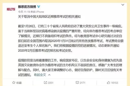 答:我们已在全球官网发布了考试取消的公告,并已将此情况以及可能对中国考生的留学申请所带来的影响陆续通知全球雅思考试认可院校和机构,并希望他们对任何延迟提交以雅思作为语言成绩证明的情况予以理解。