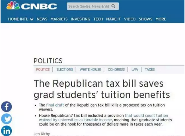 根据外媒报道,最近几周美国众参两院通过的最新共和党税改法案中,享有学费减免福利的研究生也需要缴纳个人所得税这条法案遭到全美各地大学及研究生的强烈抗议。